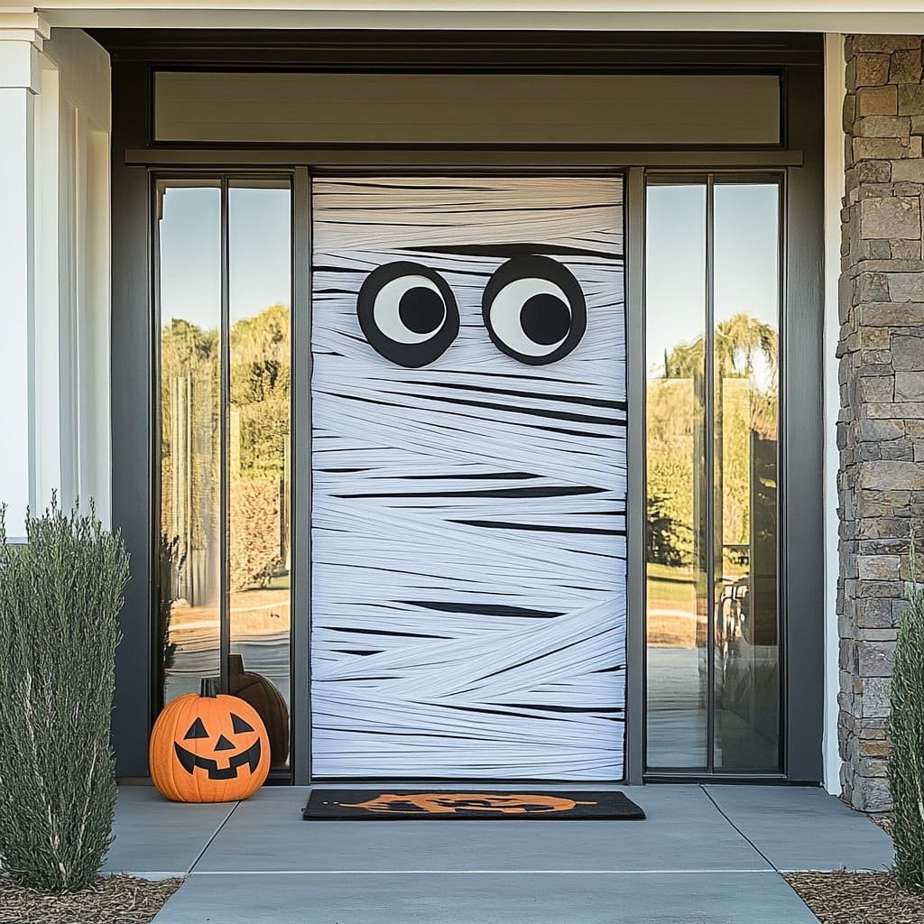 For extra effect, add two large foam eyes above the door. Paint them with red or yellow pupils for a creepy stare. Use LED lights to make them glow at night. The best part? It’s easy to take down once Halloween is over.
