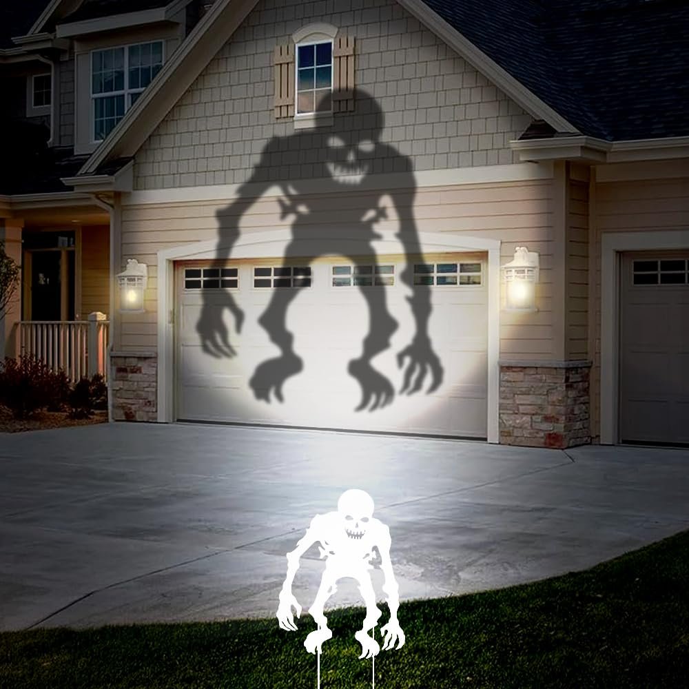Use a Halloween projector to display ghosts, bats, or skeletons moving across your garage door. Many projectors are plug-and-play and easy to set up.