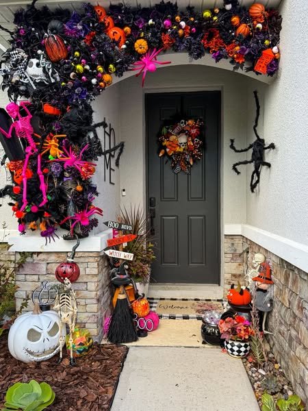 You can create different expressions happy, scary, surprised to give variety. Frame the door with orange string lights or hay bales for a warm, fall-themed touch. It feels cozy but still Halloween-ready.