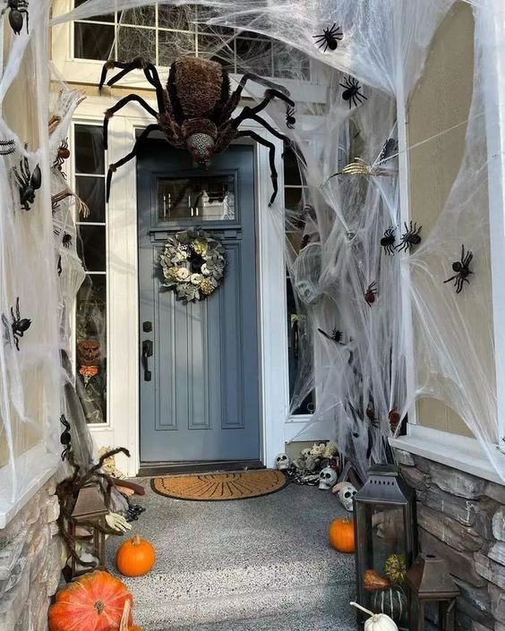 Try hanging smaller spiders from fishing line to give the illusion they’re crawling down. You can even spray a little glow-in-the-dark paint on the web so it lights up under porch lights. Cheap, easy, and totally spooky.