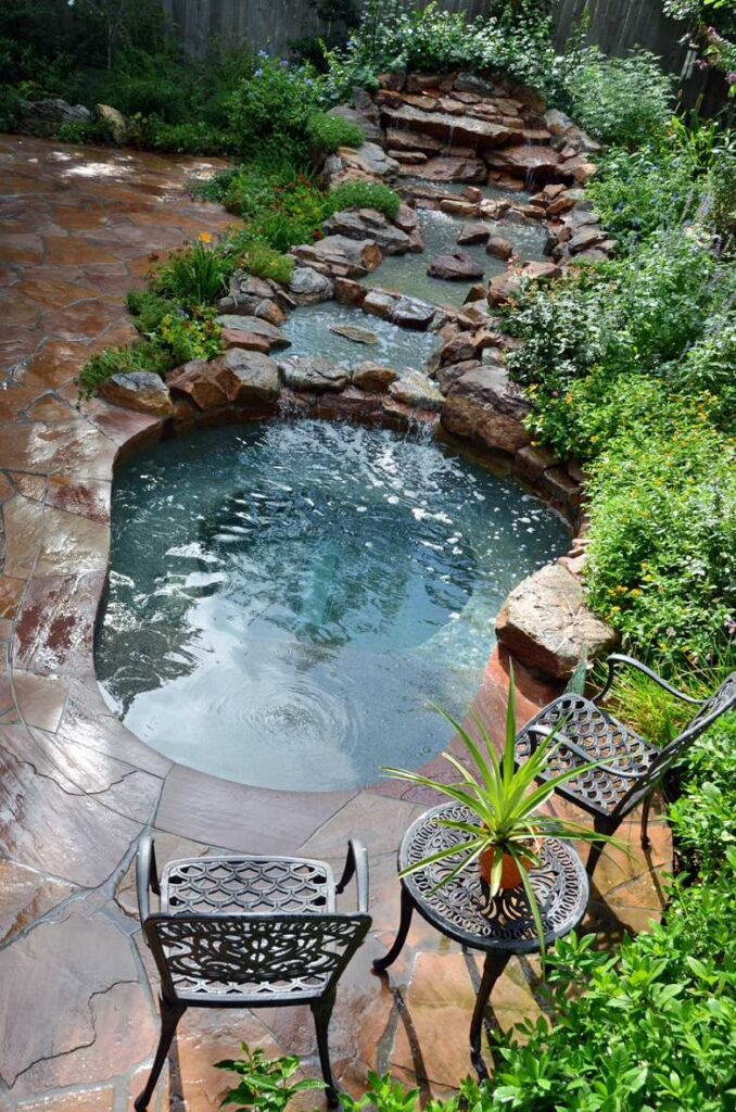 Use natural rocks to build the pool edges. Surround it with ferns, grasses, and small trees. The design works great if you love nature and want a quiet hideaway. A small wooden bridge or stepping stones add charm and beauty to the setting.