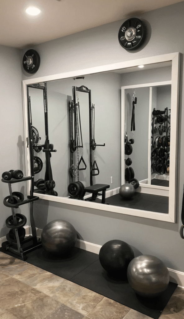 Install wall mirrors in your half garage gym to monitor form, boost brightness, and create the illusion of more space. Reflective surfaces add both style and function, turning your workout zone into a light-filled, motivating environment.