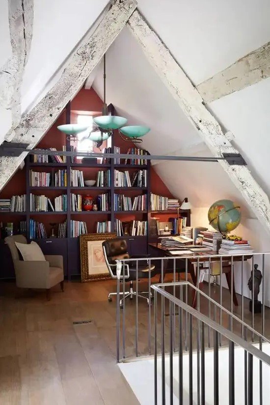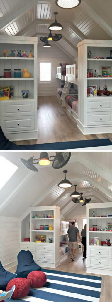 Save space and add charm by placing bookcases at the end of attic bunk beds. A clever storage solution that keeps books, toys, or décor neatly arranged while giving the sleeping area a smart and cozy look.