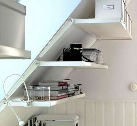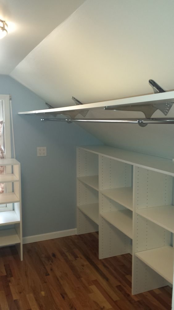 Transform attic space into a functional closet by adding shelves on the lower section and a drawer at the end. A clever way to keep clothing, shoes, and accessories tidy while maximizing every inch of storage.