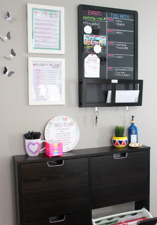 Attach small buckets for pens and markers. Use hooks for keys or bags. Add a mini shelf for a calendar or family planner.