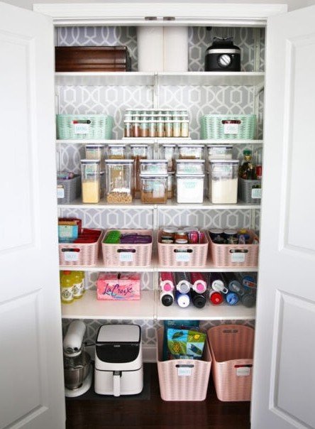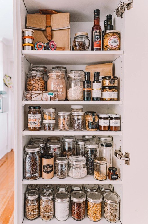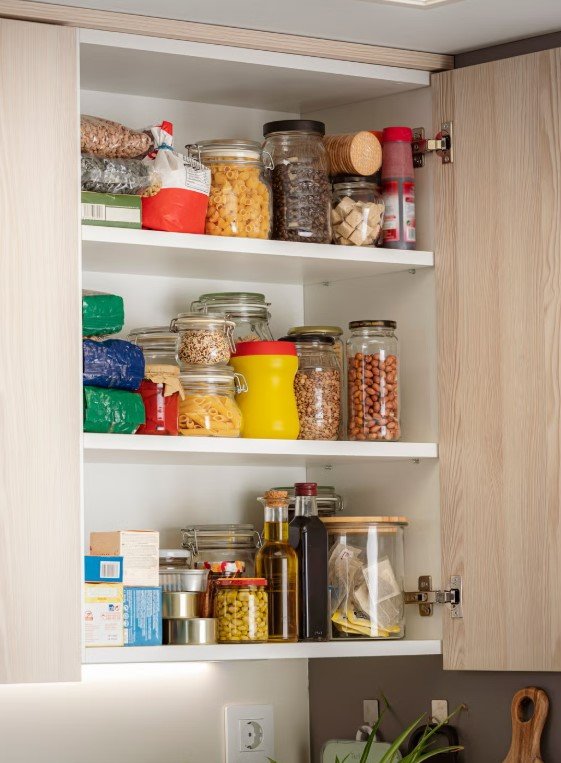 Messy bags of pasta, rice, and cereals often take up more space than needed. Switching to clear containers keeps everything neat and visible.