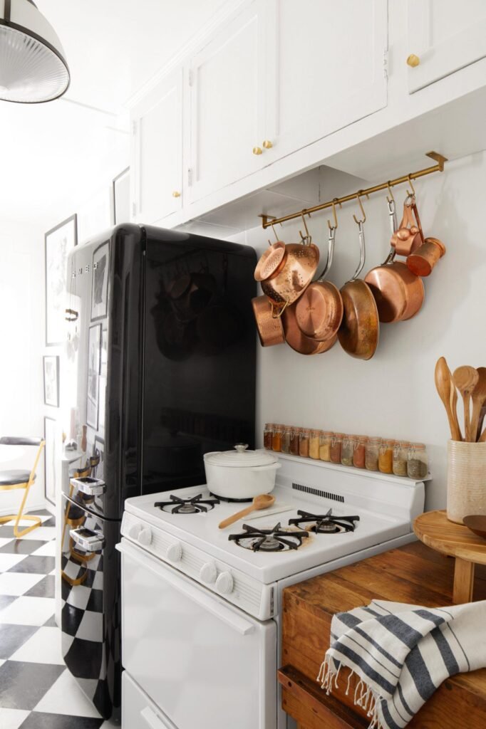 Use small adhesive hooks or screw-in ones. Hang measuring cups, spoons, oven mitts, or dish towels. This trick saves drawer space and keeps tools close to where you cook.