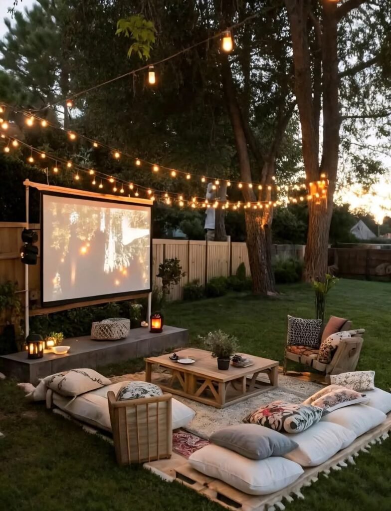 Transform movie nights by creating a cozy outdoor cinema right in your backyard. Use a blank wall or a projector screen for the display, then arrange seating with cushions, throws, or bean bags for comfort.