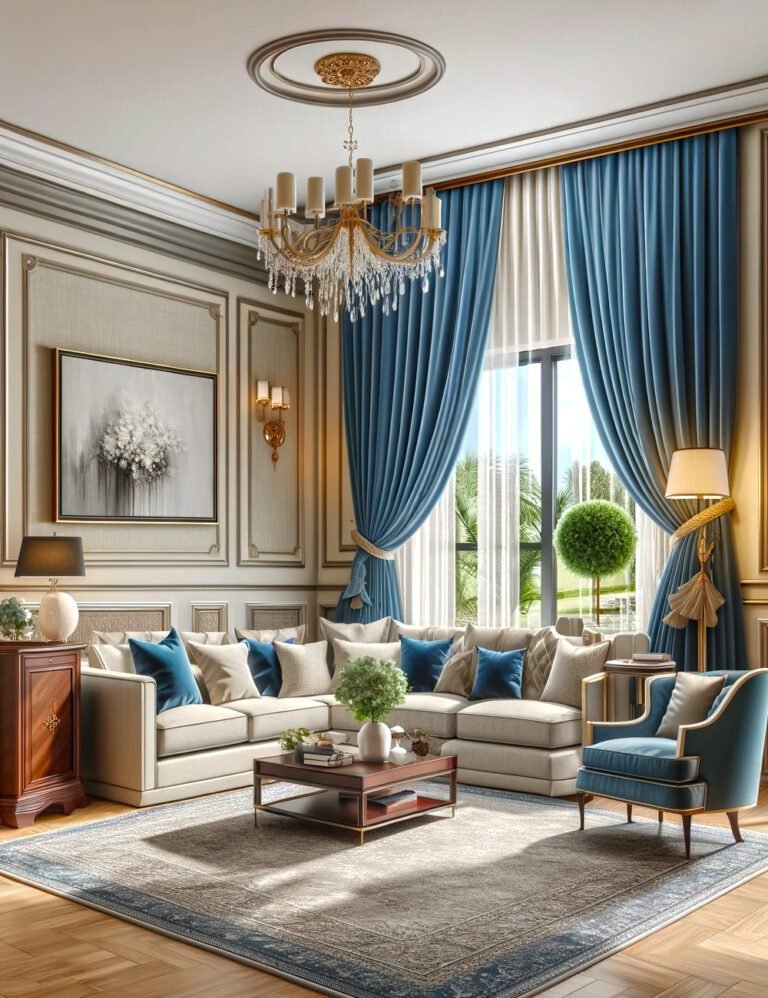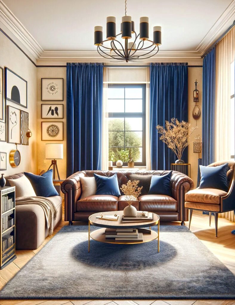 Navy blue curtains with cream walls? Absolutely — this pairing never goes out of style. Navy carries strength and confidence, offering a bold contrast against the soft warmth of cream. The result is a living room that feels refined yet approachable, with a striking depth that elevates the entire space.