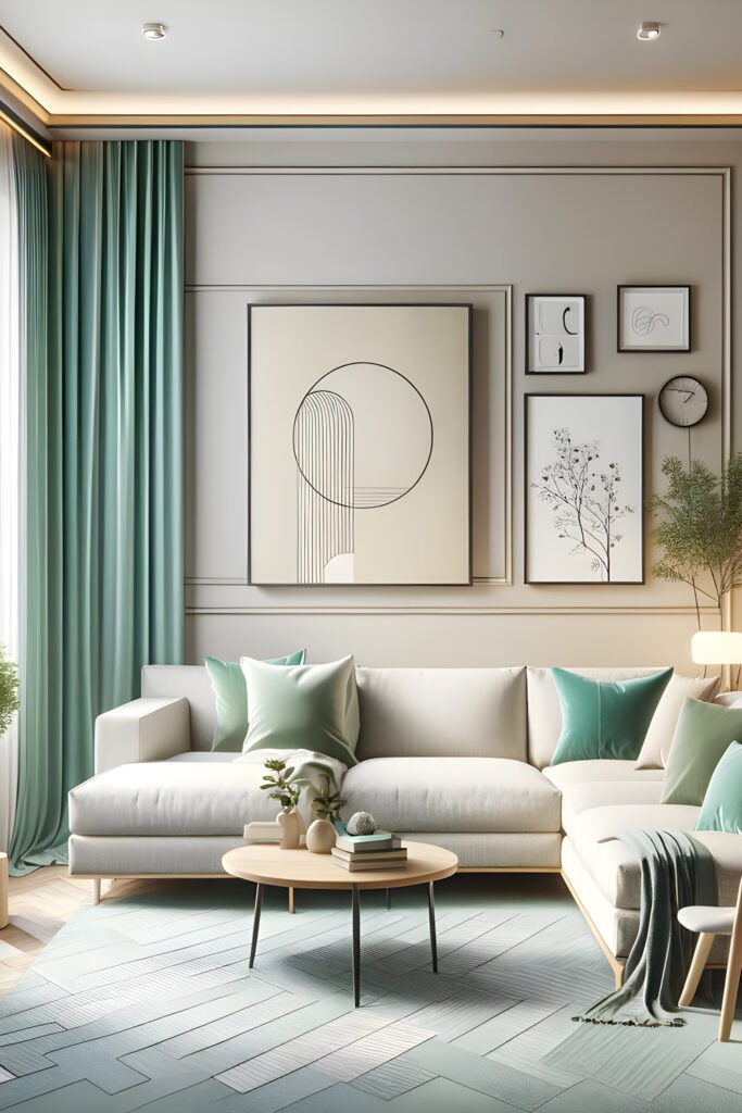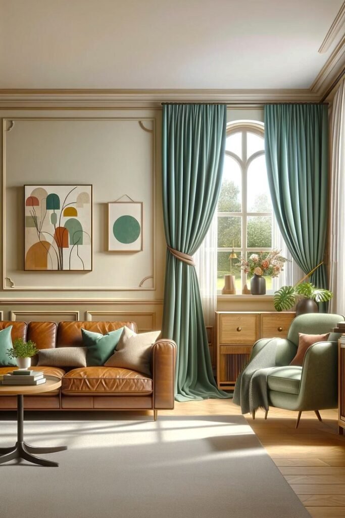 Sage green curtains bring a calming balance to cream walls, blending softness with style. The muted green adds freshness without overwhelming the space, making it perfect for living rooms that need both comfort and elegance.