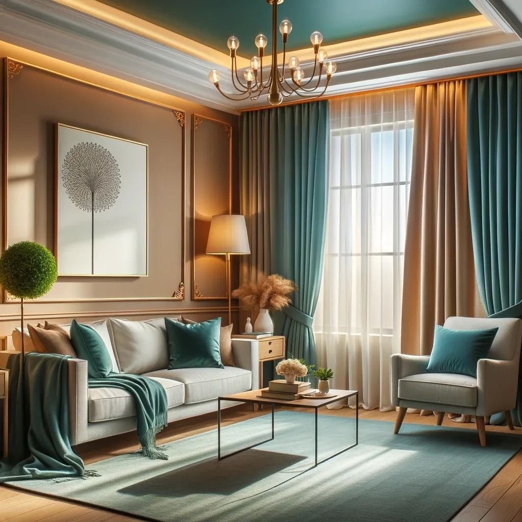 Teal curtains add bold energy and depth to cream walls, creating a striking mix of cool and warm tones. The rich hue works beautifully in living rooms, giving the space a sense of character without feeling overwhelming. This pairing is ideal for homeowners who want a balance of sophistication and personality.