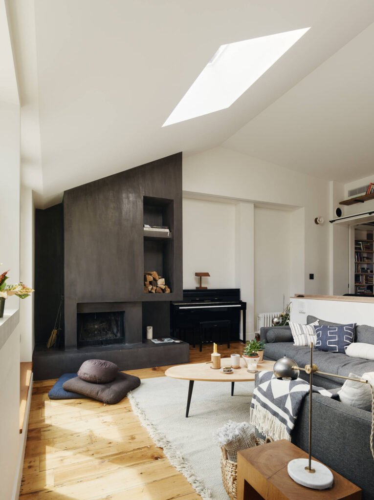 Use light wood tones, white walls, and soft textures like wool and linen. Add a few green plants for freshness. A black or gray stove-style fireplace adds contrast and warmth.