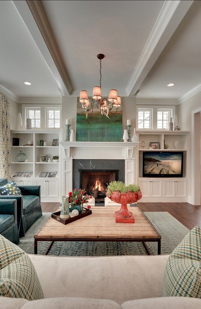 A built-in fireplace surrounded by shelves or cabinets looks both practical and beautiful. It gives you a spot for storage and display, while keeping the fireplace as the main highlight.