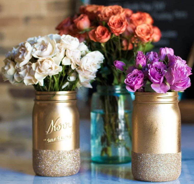 A touch of sparkle can make your tables shine. Coat the bottom half of each mason jar with craft glue, then dip it in fine glitter that matches your wedding color gold, silver, rose gold, or soft pink. Shake off extra glitter and let it dry.
