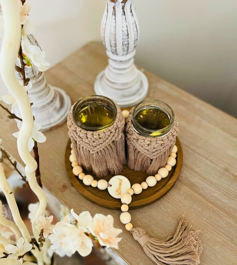 Bohemian weddings often feature handmade textures, and macramé is perfect for that. Create or buy small macramé covers made of soft cotton thread. Slip them around your mason jars, letting the fringes hang loosely.