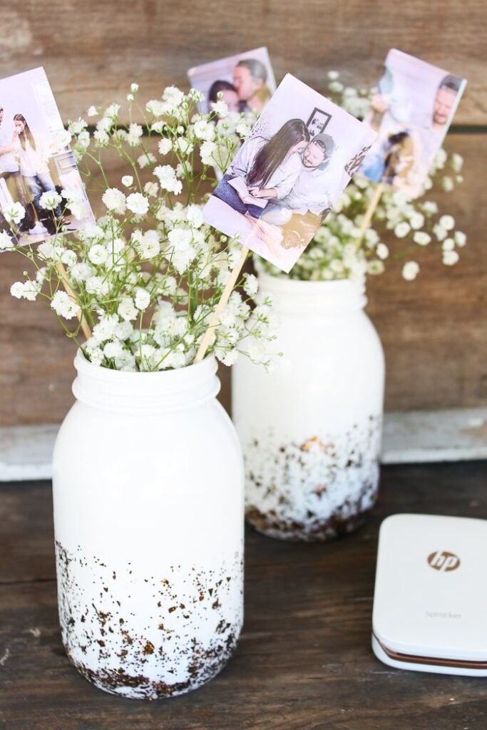 Photos always add a personal story to decor. Turn your mason jars into mini photo frames. Print small pictures of you and your partner, then roll them slightly and place them inside the jar facing outward.