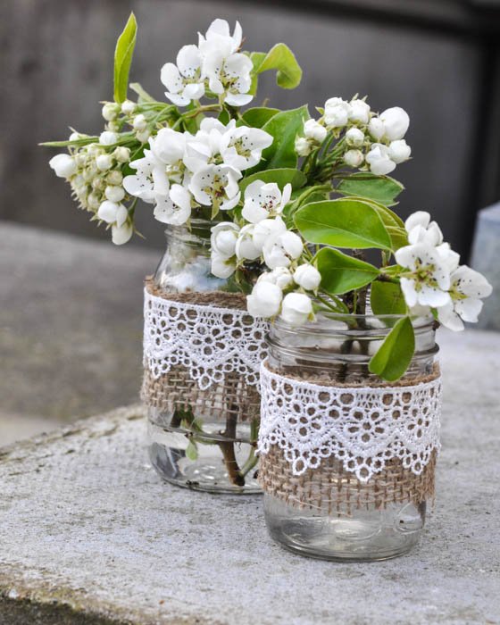 For extra detail, wrap a piece of lace or thin ribbon around the top edge. Fill the jars with flowers that complement the color like pale roses, baby’s breath, or hydrangeas.