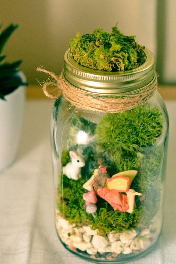 A terrarium-style jar brings greenery and a modern twist to your table decor. Start by adding a small layer of pebbles at the bottom for drainage. Then place a thin layer of soil or sand on top. Plant small succulents, moss, or mini ferns inside.
