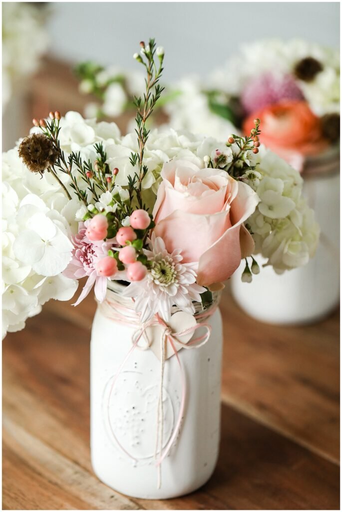 Fill these jars with wildflowers, baby’s breath, lavender, or soft pink roses. You can also use dried wheat or pampas grass for a more earthy feel.