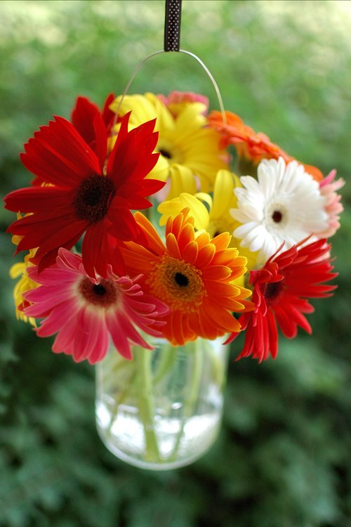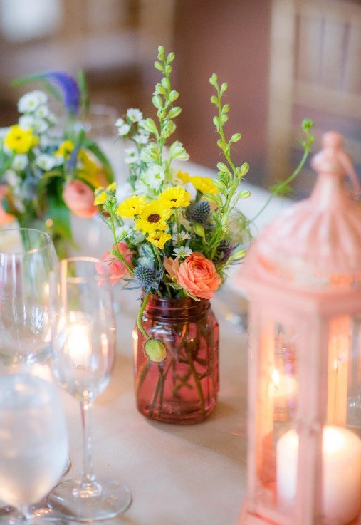 These painted jars suit spring or garden weddings. Arrange them in groups of two or three to add color to each table without overwhelming the setting.