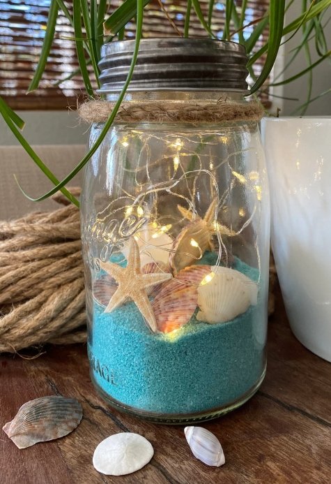 Place a candle or white flower on top. You can even wrap a thin rope around the jar neck and attach a tiny anchor or shell charm.