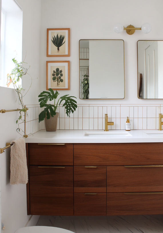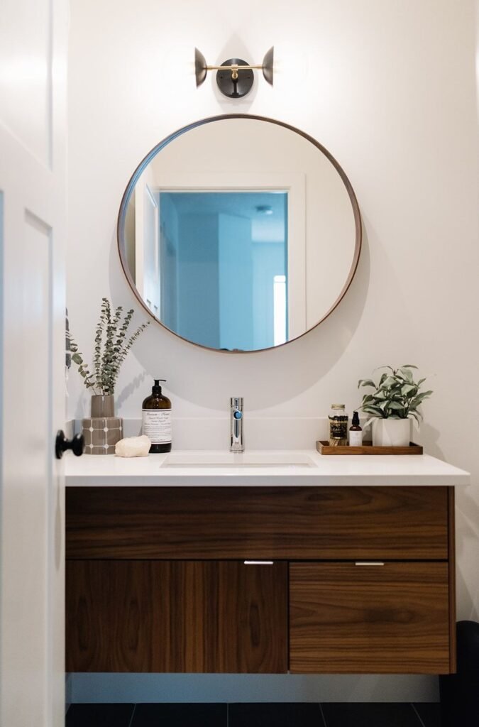A sleek mid century modern bathroom brings balance between retro style and modern precision. Clean lines, tapered wood furniture, and subtle metal details shape a look that feels crisp yet inviting. Neutral tones mixed with soft contrast—like walnut against white tile—add depth without clutter. Round mirrors, globe lights, and minimal décor keep the design fresh and purposeful. This approach turns a simple bathroom into a refined space with timeless character.
