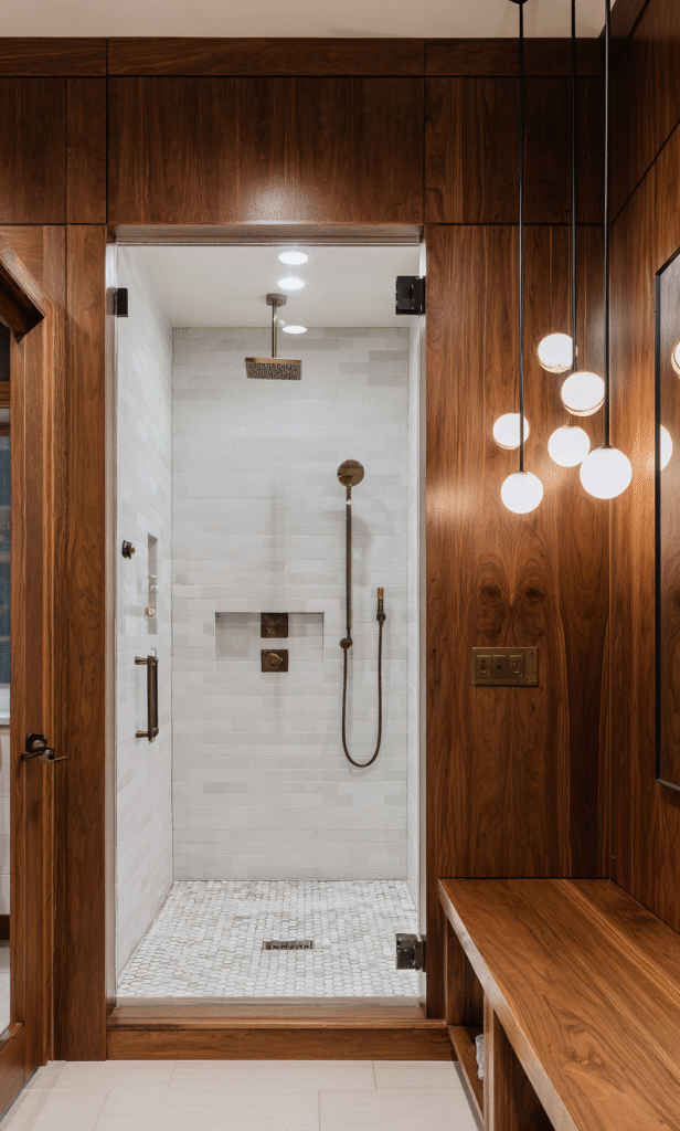 A glam mid century modern shower retreat combines classic charm with a touch of luxury. Think smooth terrazzo walls, brass fixtures, and warm wood accents that create balance and depth. Soft lighting adds a gentle glow, giving the space an inviting, polished feel. Add geometric tiles or patterned flooring for visual interest, and keep décor minimal for a clean finish. This blend of retro elegance and modern comfort turns daily routines into a small escape.