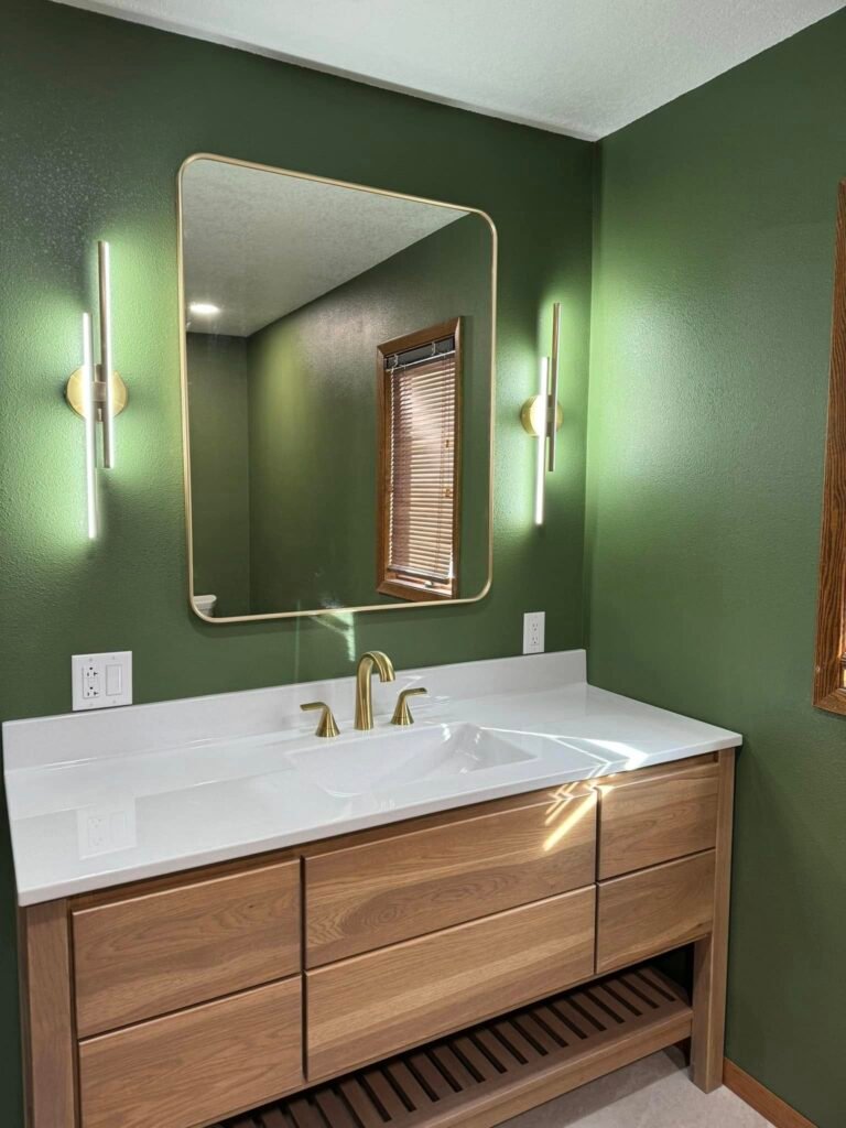 A warm green mid century modern bathroom blends earthy color with classic charm. Soft olive or sage walls pair beautifully with wooden cabinetry and brass details, creating balance and depth. Geometric tiles or terrazzo flooring add quiet personality, while warm lighting gives the space a cozy glow. Touches of white or cream help the green tones breathe, shaping a bathroom that feels calm, polished, and quietly expressive—perfect for daily comfort and timeless appeal.
