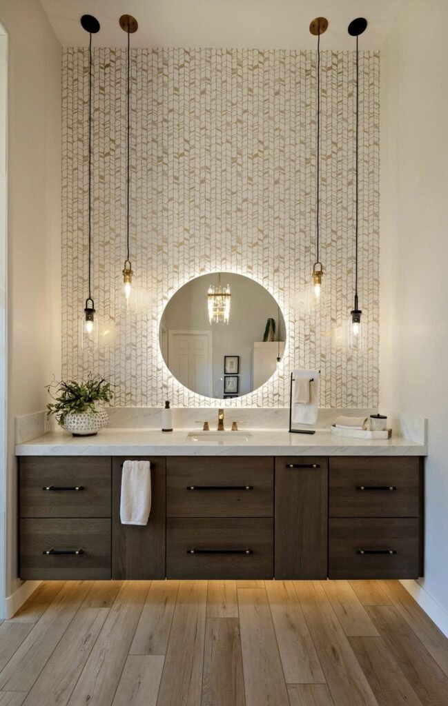 A chic mid century modern bathroom blends retro charm with clean, balanced design. Think smooth wooden vanities, round mirrors, and sleek fixtures that create visual harmony. Pair soft neutrals with muted pops of color like teal or mustard for a nostalgic yet fresh touch. Add geometric tiles and gentle lighting to shape an inviting atmosphere that feels refined without trying too hard. The result—effortless elegance with timeless appeal.