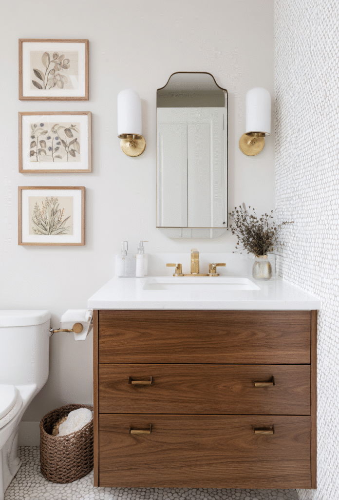 A warm multifunctional mid century bathroom blends purpose with style. Wooden accents, soft lighting, and clean lines shape a space that feels grounded yet sophisticated. Combine a floating vanity with brass details and patterned tiles for character and comfort. Use open shelving for practicality without cluttering the look. Add greenery or textured towels for a gentle layer of warmth that turns everyday routines into something pleasantly refined.
