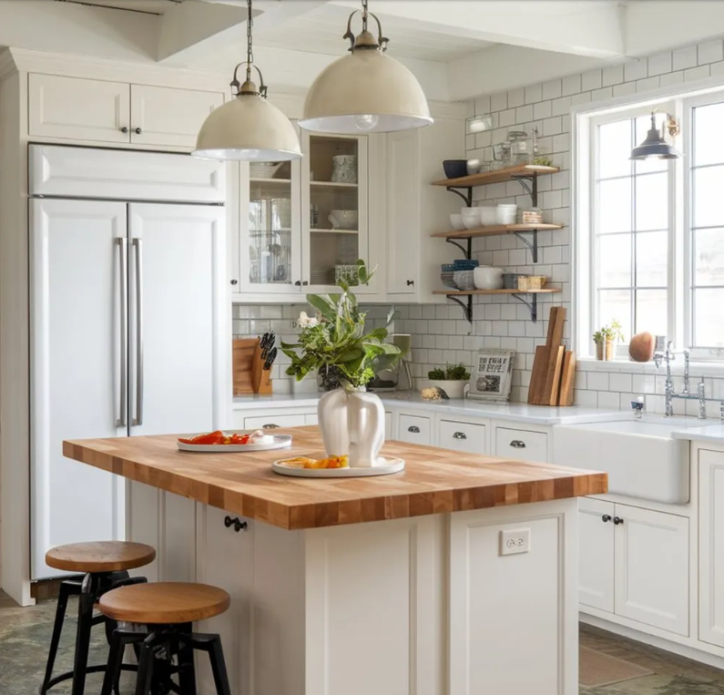 That butcher block island with a waterfall edge feels like your kitchen’s favorite oversized sweater—warm, grounded, and quietly stylish. It’s the piece that makes everything around it look more intentional, giving off that relaxed coffee shop charm where meal prep suddenly feels like self-care.