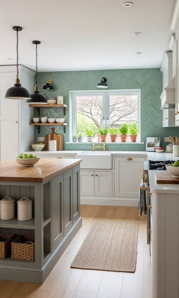 That sage green herringbone backsplash you keep pinning? It’s like the kitchen version of finding a vintage band tee that fits perfectly—unexpected, laid-back, and effortlessly cool. The pattern adds just enough structure to feel intentional, while the color keeps things calm, never loud. It’s timeless, but with a quiet wink.