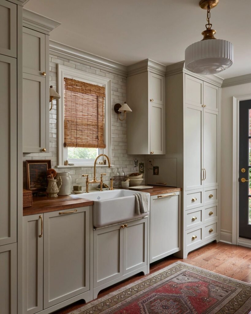 - Cabinet Upgrade: Refresh existing cabinets using Farrow & Ball “Pigeon” No.25 or Benjamin Moore “October Mist” 1495—muted greens that feel elevated and quietly confident.