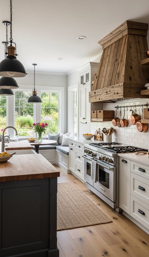 - Hood Surround & Walls: Use Benjamin Moore “White Dove” OC-17 for a creamy neutral backdrop that lets reclaimed wood tones stand out without harsh contrast.