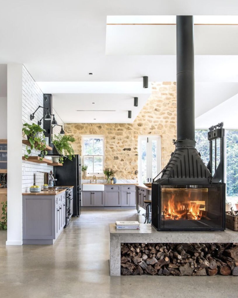 The modern version often features glass on two sides for better flame visibility. Surround it with clean tiles or stone for texture.