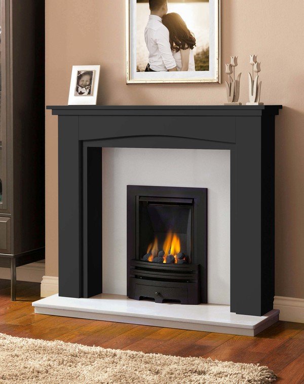 Choose a black glass or metal frame for a clean finish. Glass beads or white stones inside the firebox can add texture and shine. The result feels both modern and timeless.