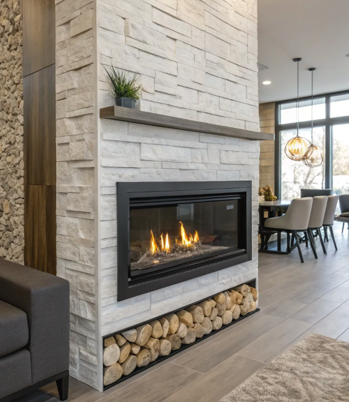 A double-sided fireplace doesn’t just warm your home—it redefines how spaces interact, adding flow, depth, and quiet sophistication to your layout.