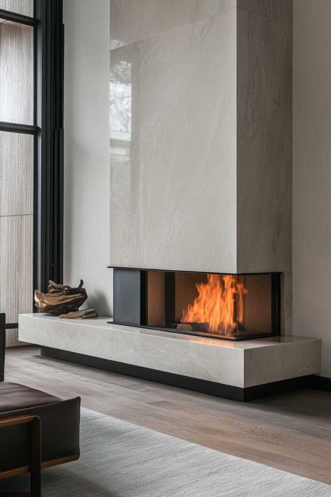 A vertical fireplace brings both elegance and efficiency—proof that smart proportions can completely reshape how a space feels.