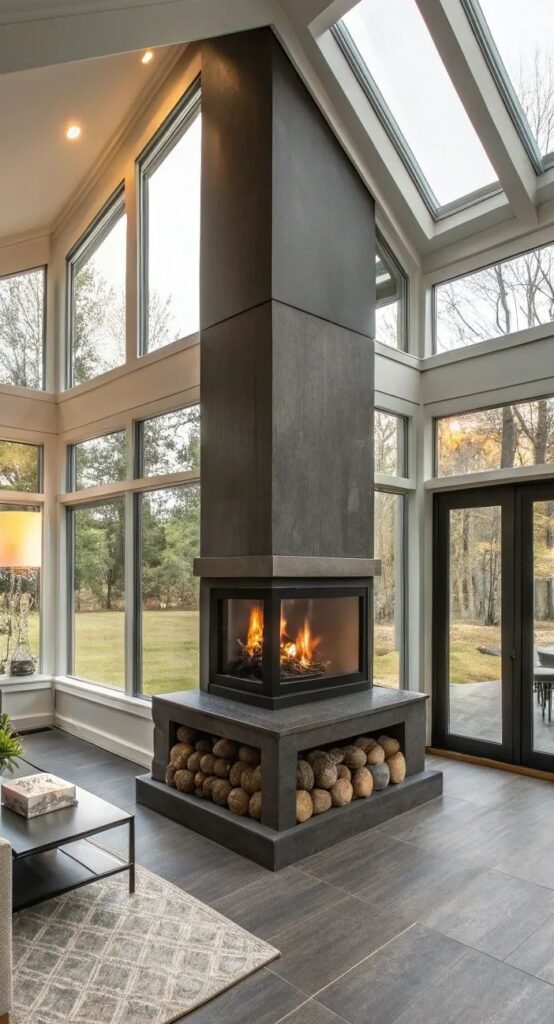 A double-sided fireplace brings harmony and sophistication by connecting two spaces through a shared flame. This design adds warmth and visual continuity, making both rooms feel open yet intimate. It’s a clever architectural choice that turns an ordinary divider into a glowing centerpiece that feels intentional and artful.
