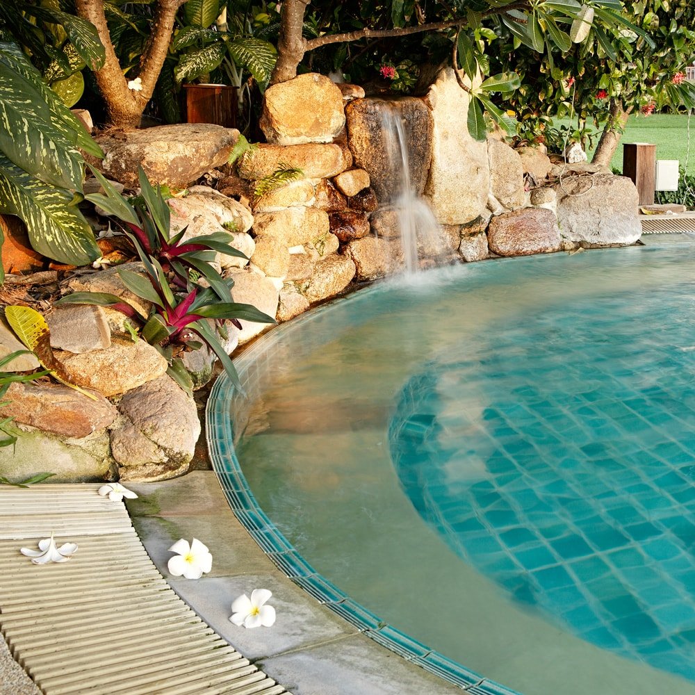 Plants such as palms, ferns, or vines add to the natural theme. Owners often use warm-toned lights hidden in rocks for a soft glow at night.
