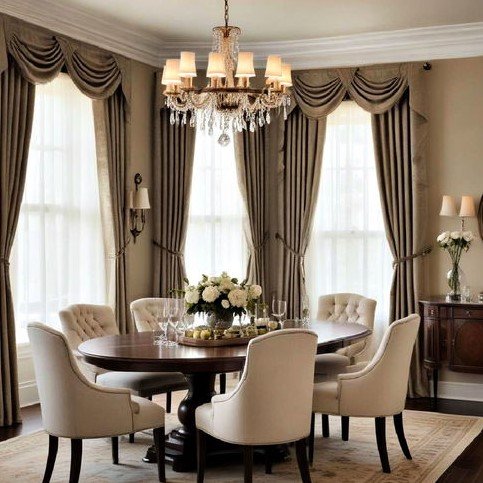 Elegant draperies bring texture, drama, and refinement to a dining space, creating a sense of quiet luxury. The right fabric can shift the mood of the entire room—soft velvet lends depth and grandeur, while flowing silk catches the light beautifully, adding subtle movement and sheen. Beyond their graceful appearance, draperies serve a functional purpose by softening acoustics, adding warmth, and providing privacy.
