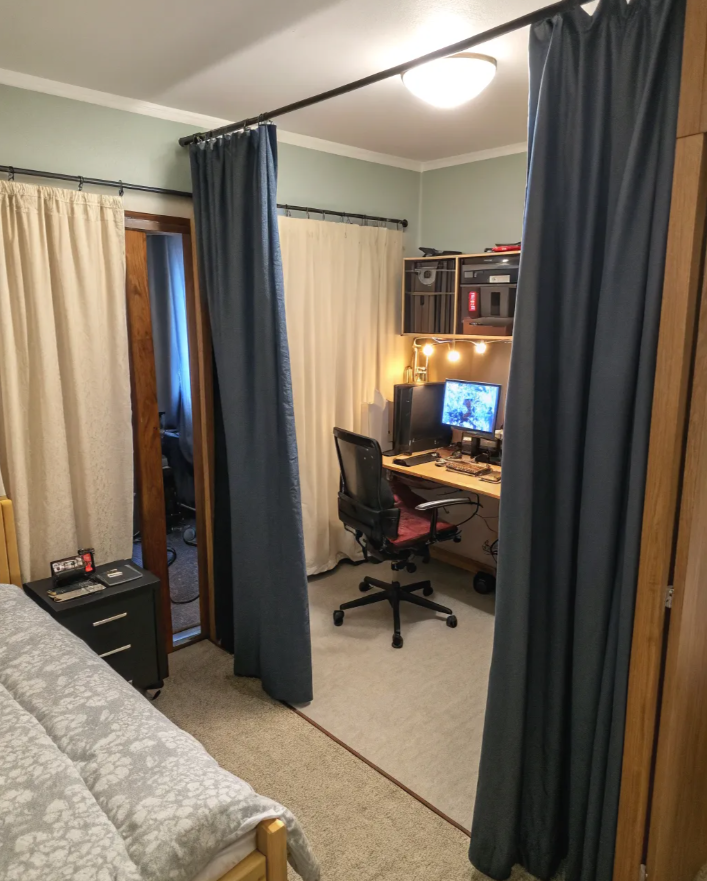 Use curtains to create partitions in a compact room, giving you the option to divide gaming and sleeping zones with ease. This clever setup redefines your layout without major construction.