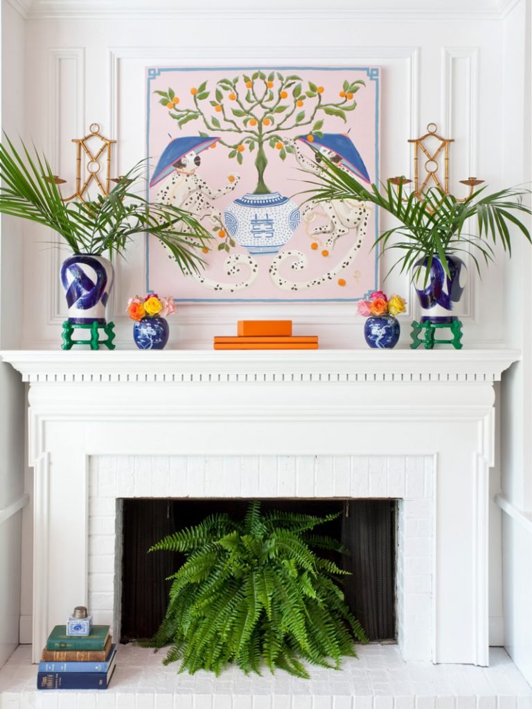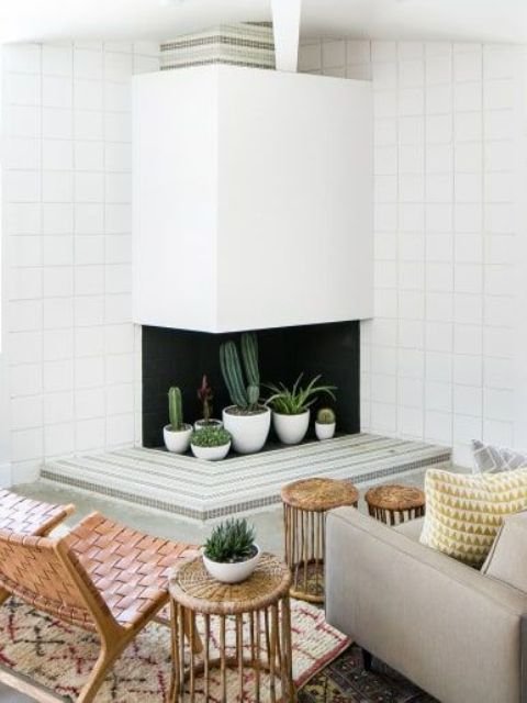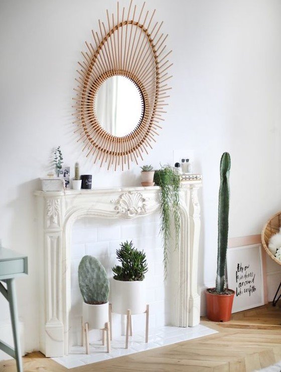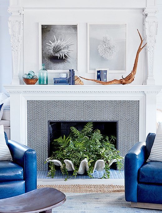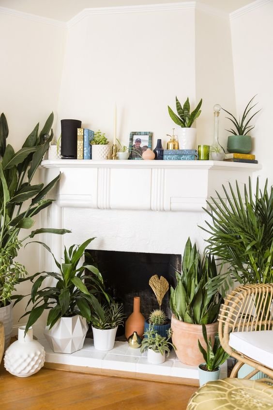 Bring life to your unused fireplace with plants or floral arrangements. Ferns, succulents, or dried grasses create texture and color while maintaining a relaxed, natural look. Use baskets, planters, or vases to layer height and dimension.