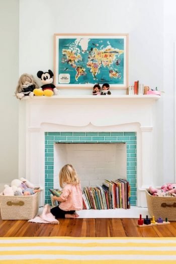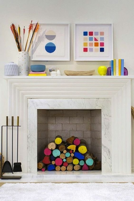 A bright space with a non-working fireplace and colorful firewood inside, with pretty books, vases and artworks is amazing.
