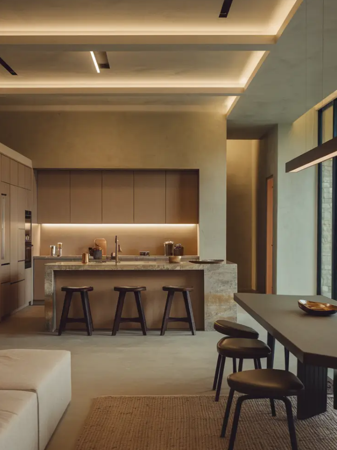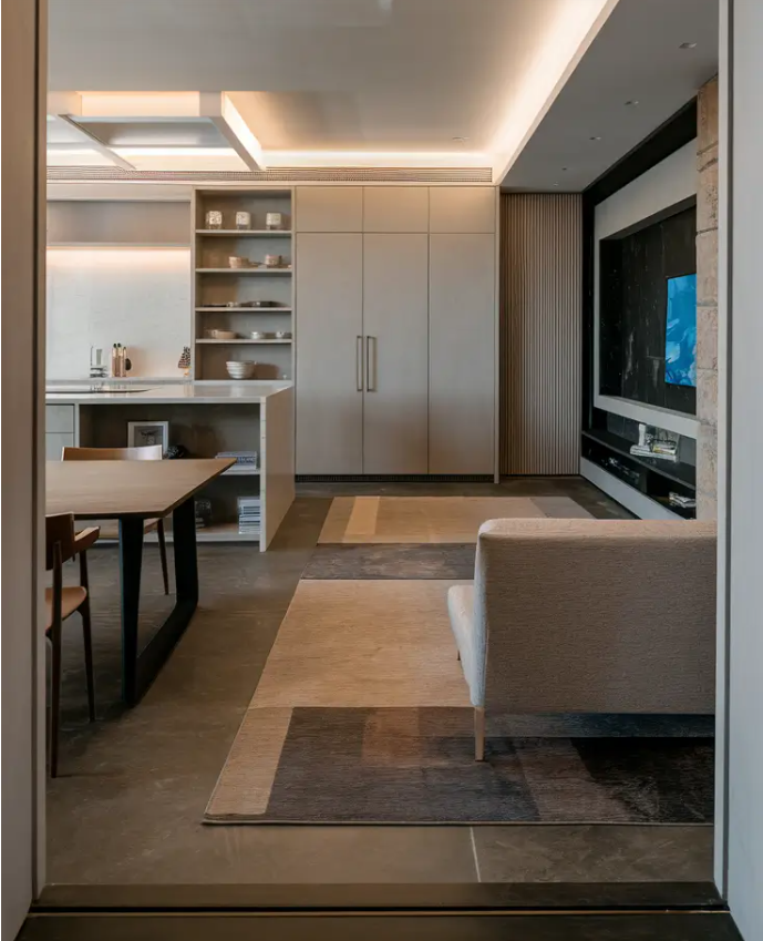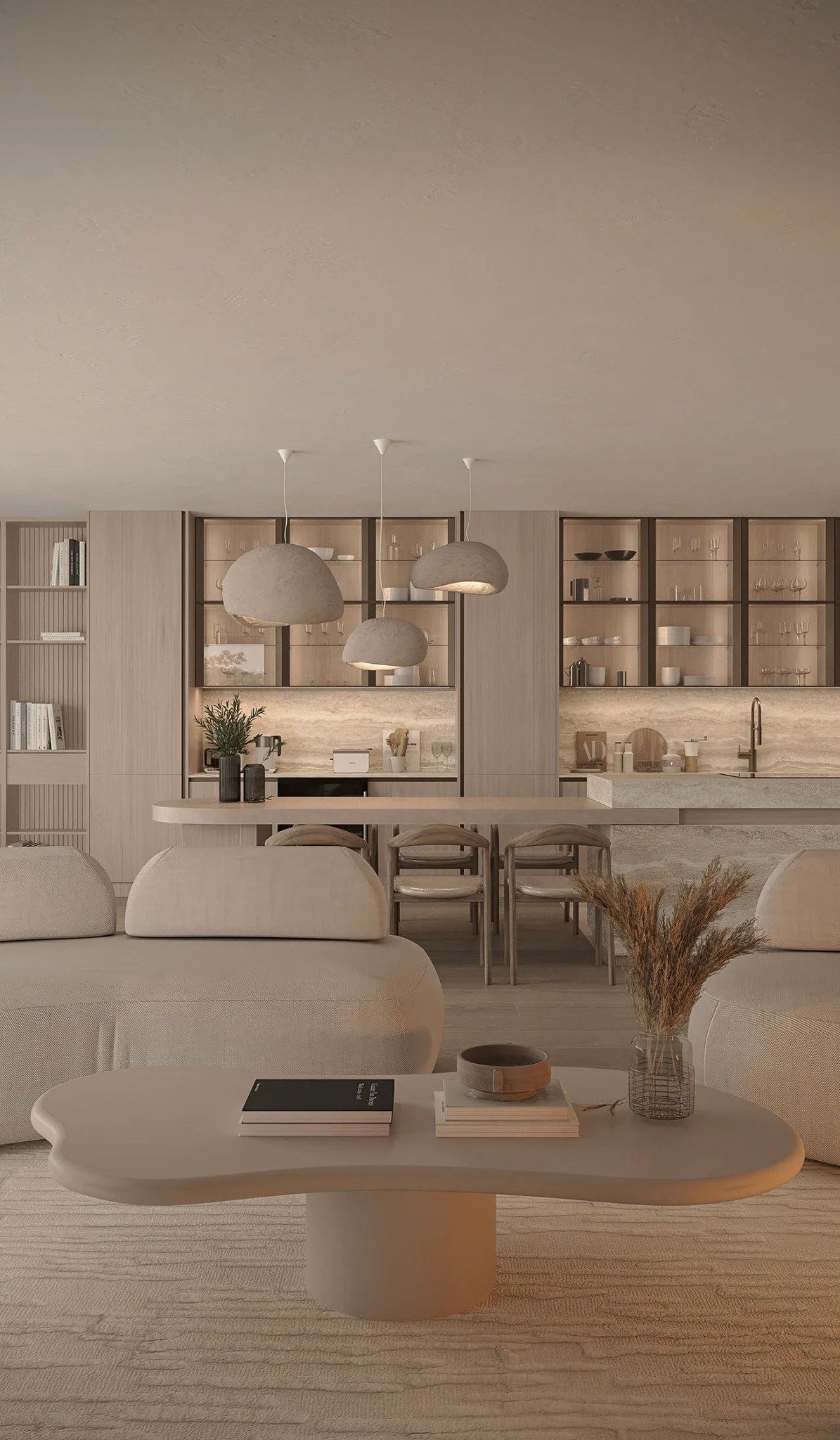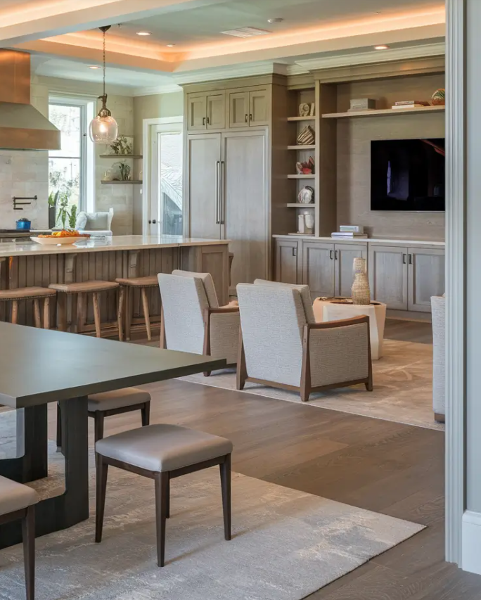 To push the concept further, I’d include a reeded-glass cabinet that shifts between breakfast pantry and bar, plus a low open shelf that lightly separates lounge and dining. A media wall with a two-tone cabinet pattern can add structure. If the architecture is especially open, a shallow ceiling coffer above the table helps anchor the dining zone within the larger plan. These moves produce a polished, livable composition.