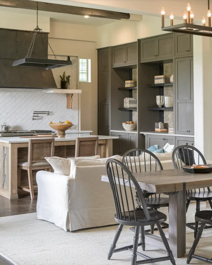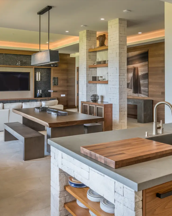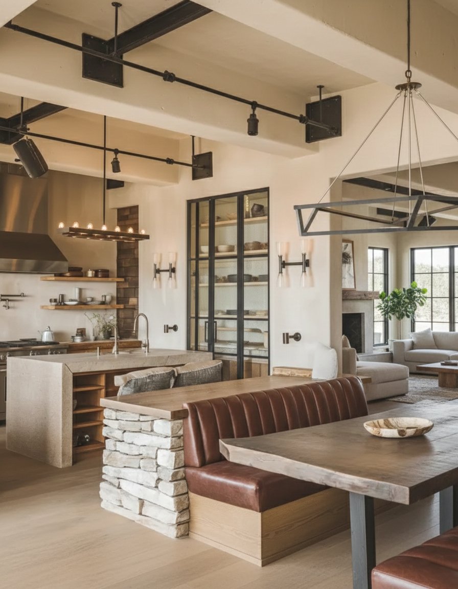 I shape the scheme around a stone waterfall island, a deep open kitchen living room couch with clean lines, and an 8-seat table for real hosting. Library-style sconces on built-ins and a linear chandelier above the table establish a clear hierarchy across the layout. If a rustic hint fits the home, I may add a subtle barndominium accent through darkened steel or wire-brushed oak. For a brighter mood, a Scandinavian tilt with pale wood and woven texture keeps everything airy.
