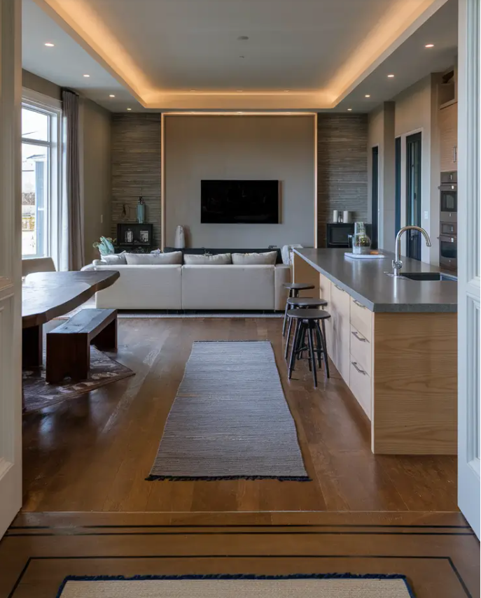 For stronger harmony, add a divider that filters light instead of blocking it—an open shelf behind the couch, a glass-front cabinet, or a slatted panel. A narrow runner under the island stools warms the kitchen side, while a broader rug outlines the lounge. If your table floats, a centered ceiling medallion or a subtle coffer gives it a clear spot in the architecture so the overall plan reads cleanly.