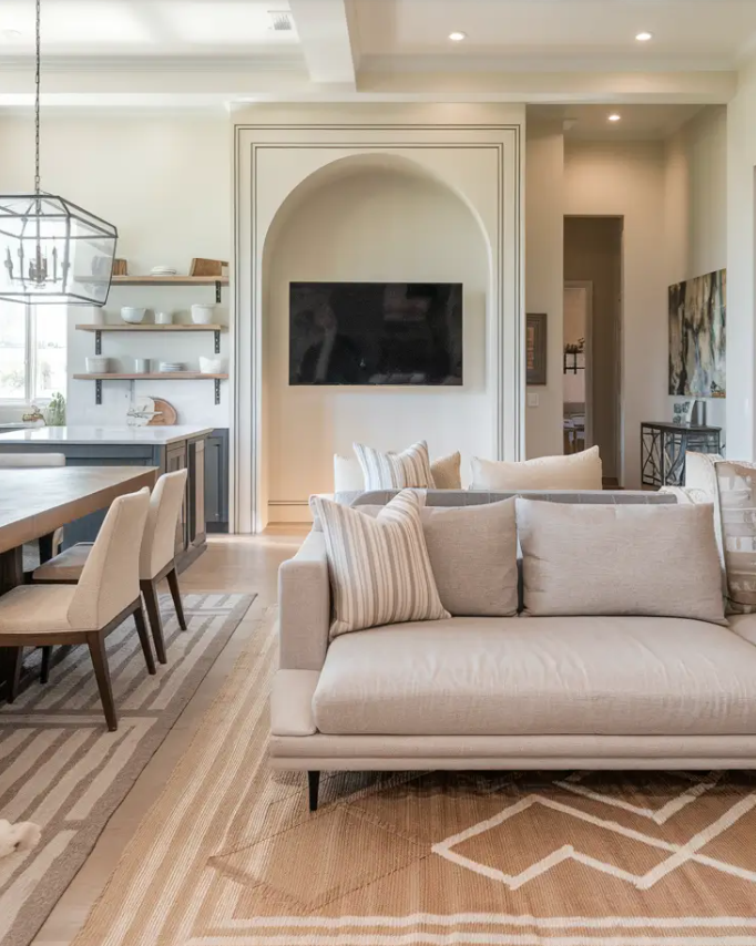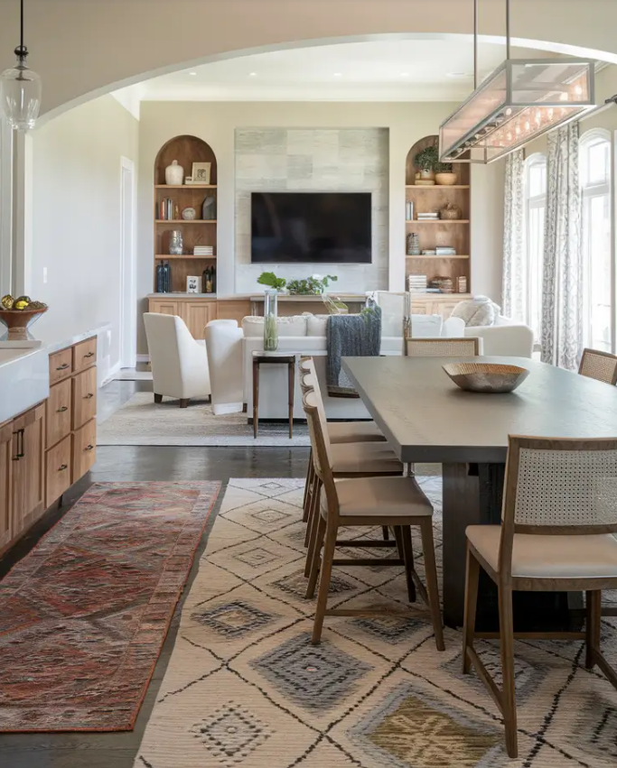 To reinforce the look further, add a shallow arch at the dining niche or bring in paneled wainscot for grounding the lounge seating. A two-tone cabinet scheme echoed on the media wall connects kitchen and living areas into one coherent layout. Finish by placing a large natural-fiber rug under the table to define the dining zone and guard flooring while chairs glide easily. These elements weave mixed influences into one clear composition.