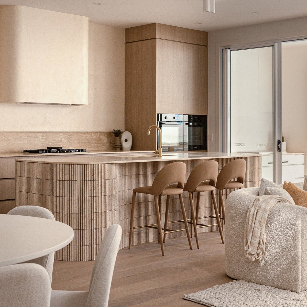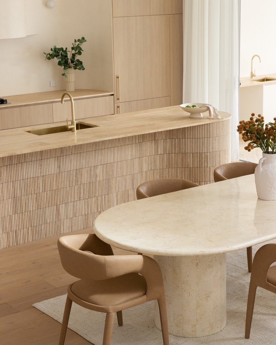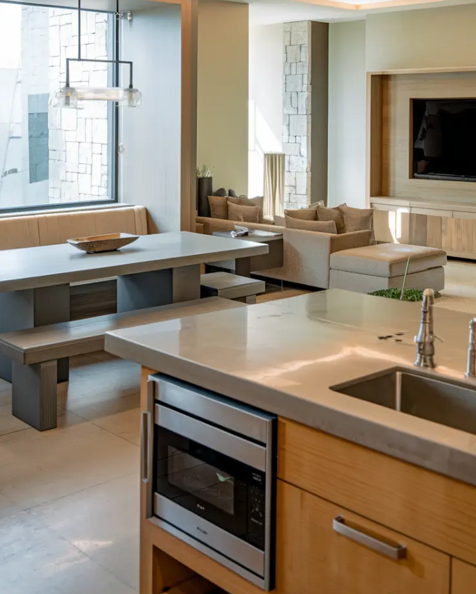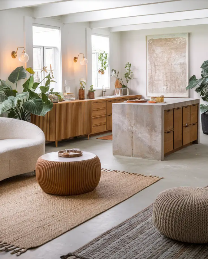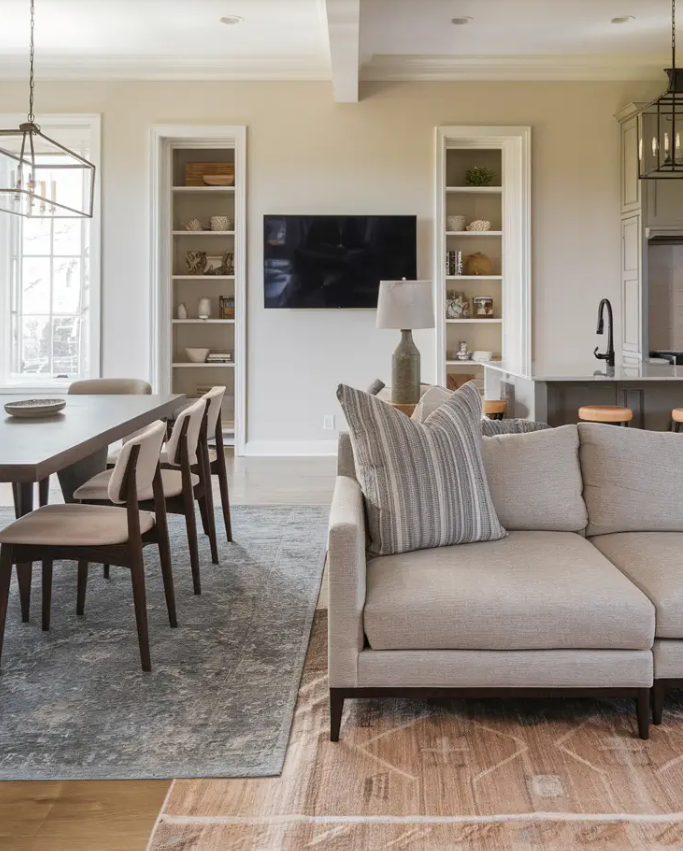 I often choose woven pendants above the table, ribbed cabinet fronts, and a flat-weave rug that slides easily under dining chairs. A boucle or linen-blend couch pairs well with a rounded coffee table to soften edges in busy pathways. On the kitchen side, panel-ready appliances and a continuous slab backsplash matching the counter help the space read cleanly. Art ledges, larger sconces, and one tall plant finish the decor without cluttering the floor.