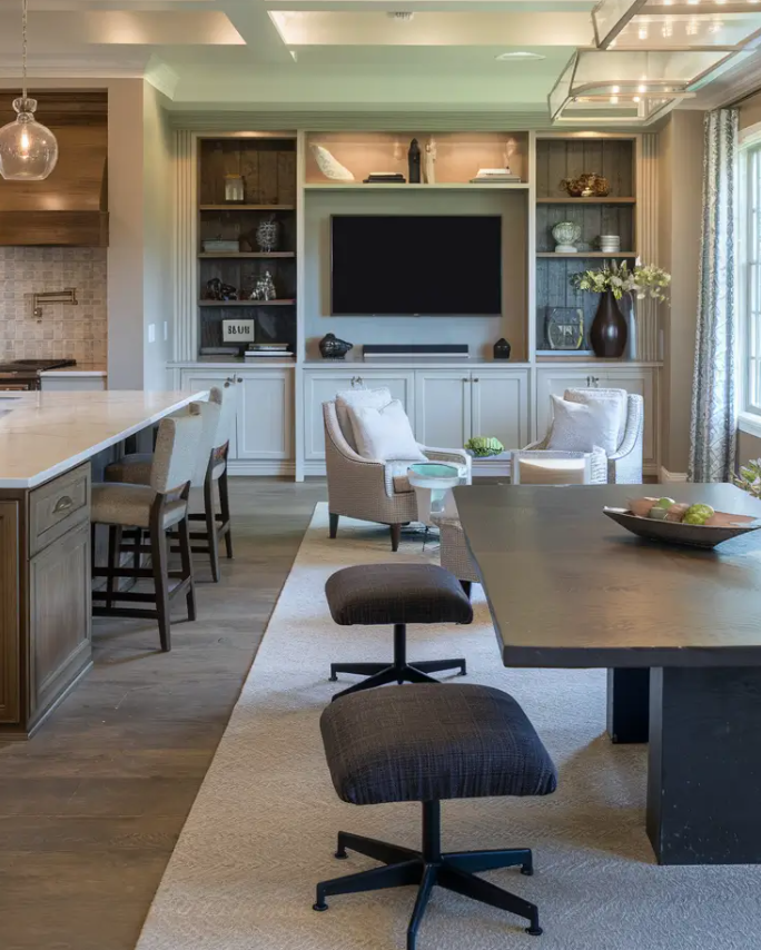 Where space allows, I specify a 9–11 foot island with 42 inches of clearance on all working sides and 36 inches along general paths. The dining zone gets a rectangular table that seats six to eight, with a linear pendant marking the center point. Seating may be a right- or left-arm sectional or a sofa with two chairs, depending on doorways and window positions. A coordinated rug plan defines each area without breaking flow.